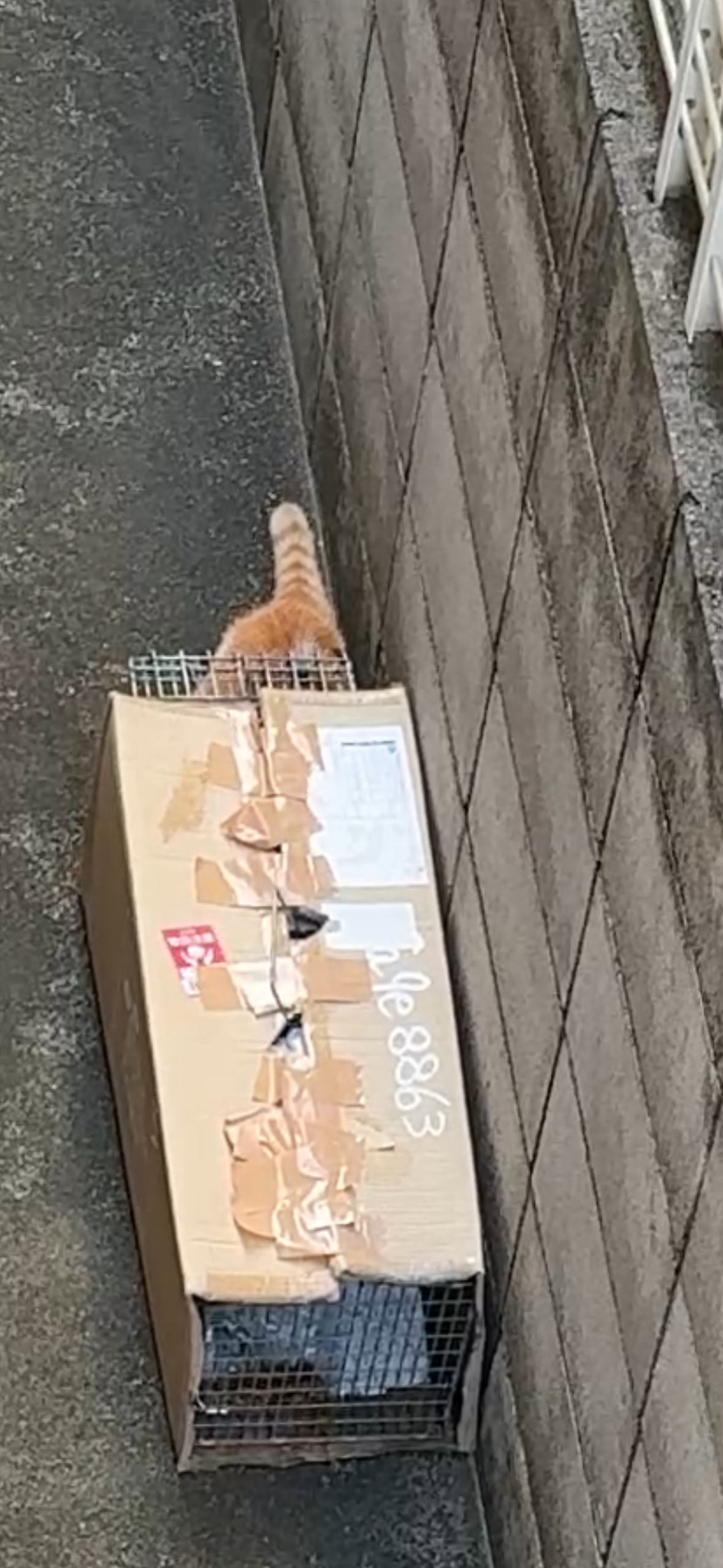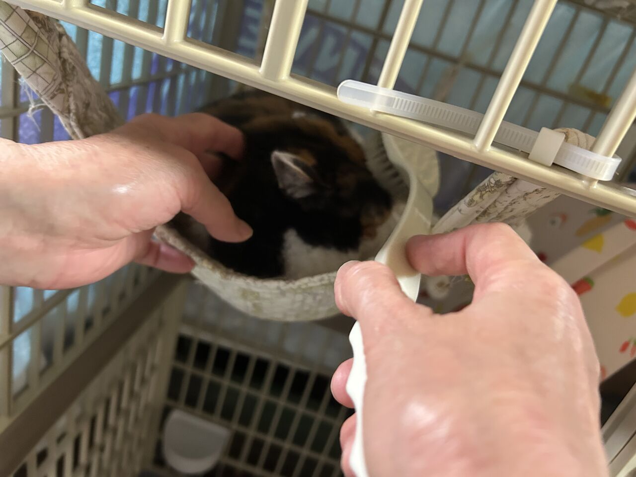 そんな不安を感じたものの、幸いにもケージ大好きなサンちゃんは、ケージに入っているときにネットを被せて捕まえることに成功しました。(あの子を入れられるネットなんてあるのか?と協会のTさんに言われたが…)来た時から3年という歳月の間に、充分には心を許していないものの、保護当初のあの激しい攻撃性が消滅しているのは幸いでした。(食べていないせいかも?)